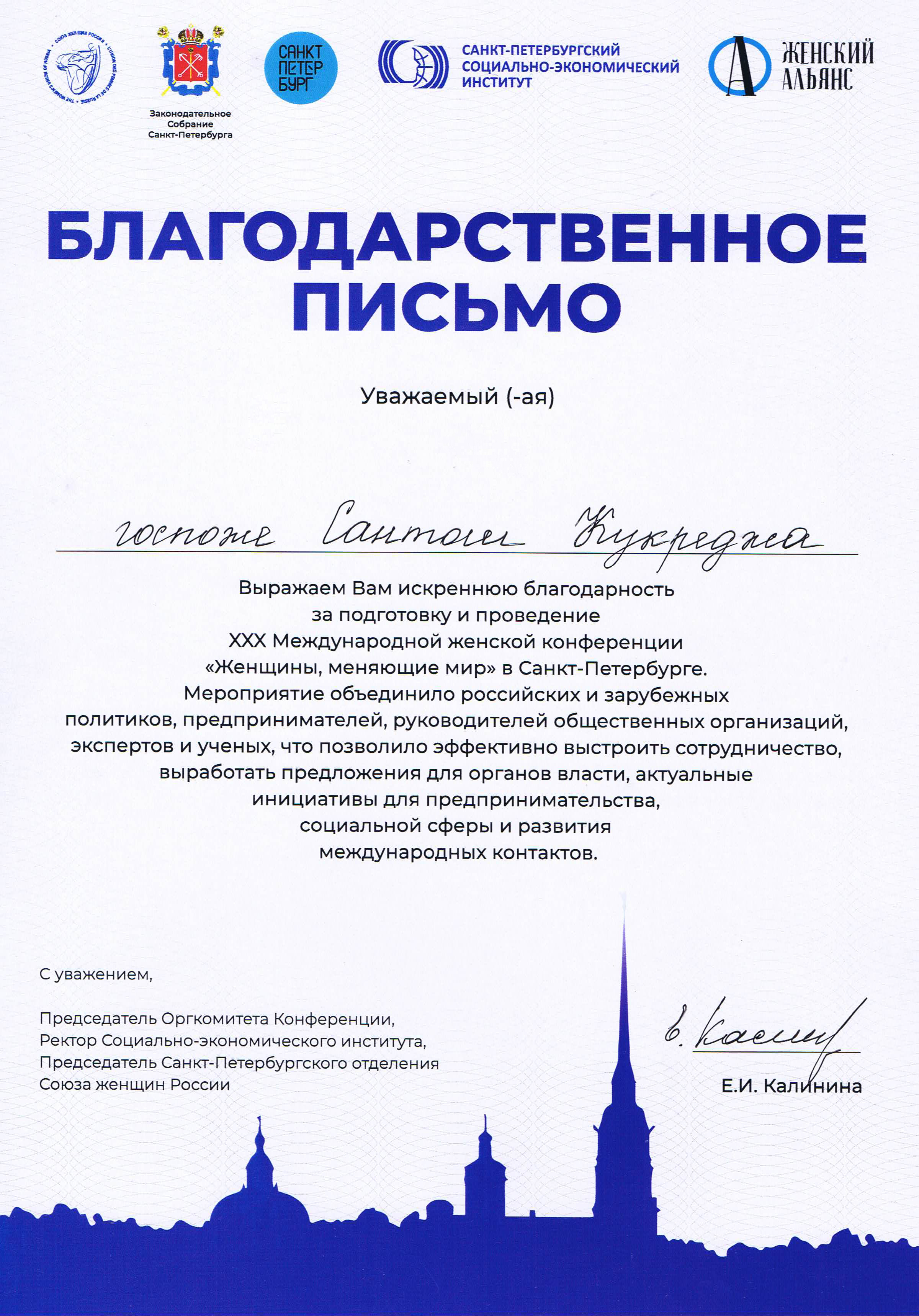 Выражаем искреннюю благодарность за подготовку и проведение ХХХ Международной женской конференции "Женщины, меняющие мир" в Санк-Петербурге.